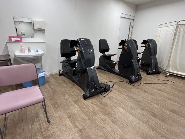急性発症した心大血管疾患や心臓血管外科手術後の患者さまに対し、ICUなどの集中治療を要する超急性期から早期離床・早期退院・廃用症候群発症予防を目的にリハビリテーションを開始しています。また急性期だけでなく、生命予後改善・QOL(生活の質)の改善・再発予防などを目的に回復期・維持管理期においてもリハビリテーションを継続していただいております。心大血管疾患に対するリハビリテーションは運動療法・日常生活指導を中心とした包括的医療プログラムによって行われ、心肺運動負荷試験(CPX)の結果から、個々の患者さまに最も適切な運動量・時間を決定し、スタッフの監視のもと、安全に配慮して運動療法を行っています。