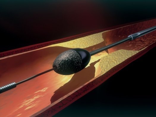主に手首の動脈から冠動脈にカテーテルを進め、治療を行います。多くの場合、狭窄部位を風船で拡げ、ステントという金網を留置します。薬剤溶出性ステントの使用によりカテーテル治療のアキレス腱と言われた再狭窄率は数%にまで低下しました。