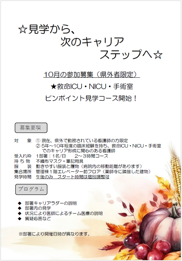 この度当院では、高度急性期領域に関心のある県外の看護師さんを対象に、救命センターICU、新生児集中治療室(NICU)、手術室の「キャリア見学コース」を期間限定で開催いたします。