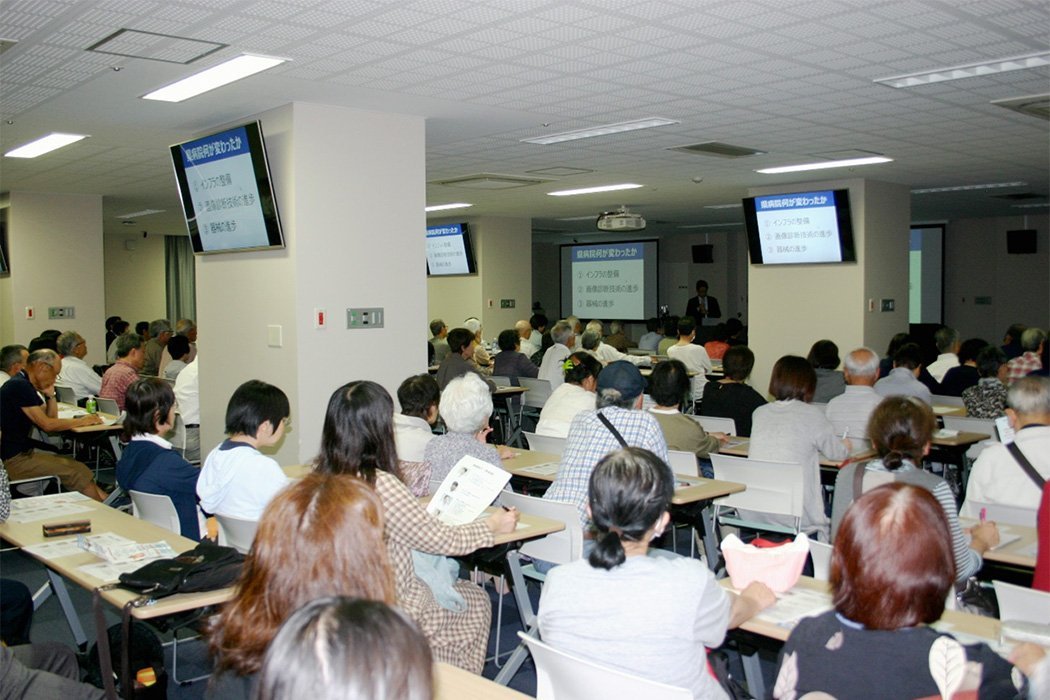 循環器病センターは、医療や病状への正しい理解を目的とし、定期的に市民公開講座を行っております。当院の専門医や薬剤師、栄養士、理学療法士の講演やQ&Aコーナーは多くの方から好評の声をいただいております。