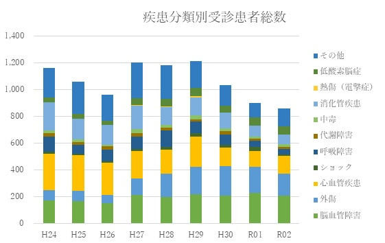 図は原因別受診患者総数です。脳血管障害、外傷の割合が増加しております。